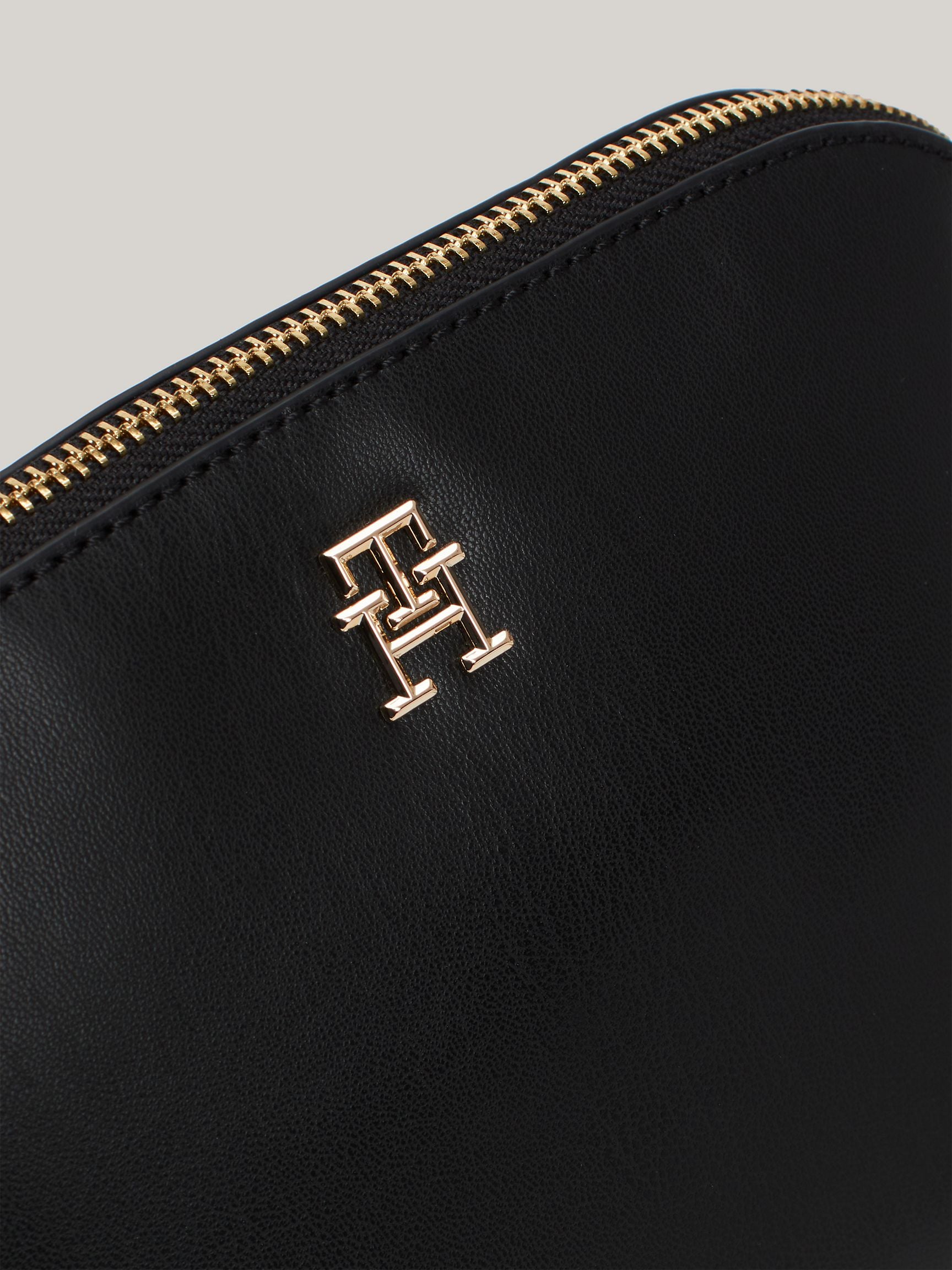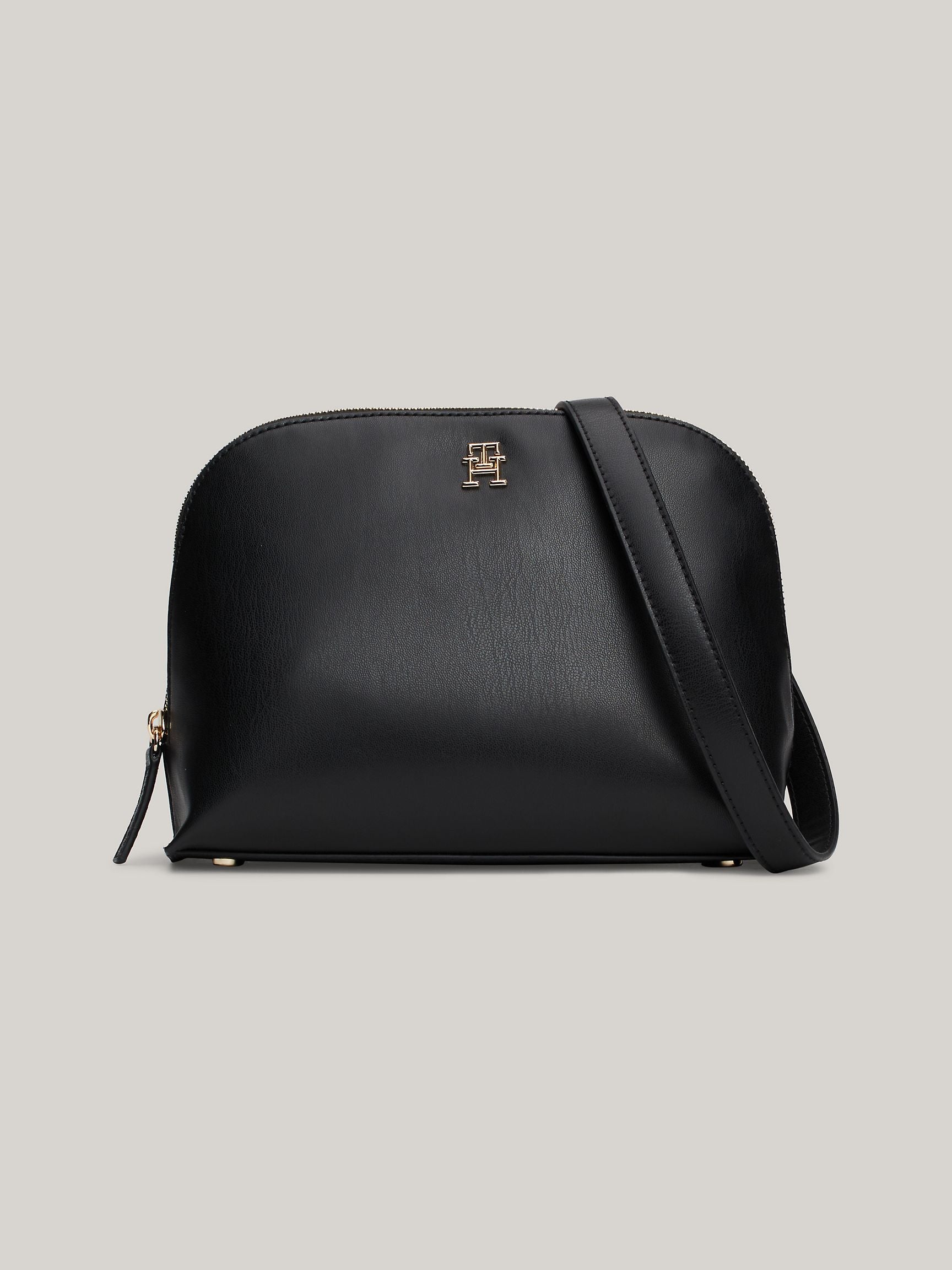 Featuring bold signature logos and gleaming gold hardware, this sleek black crossbody commands attention. Equipped with a detachable, adjustable strap, it offers fearless style and effortless comfort on the go.